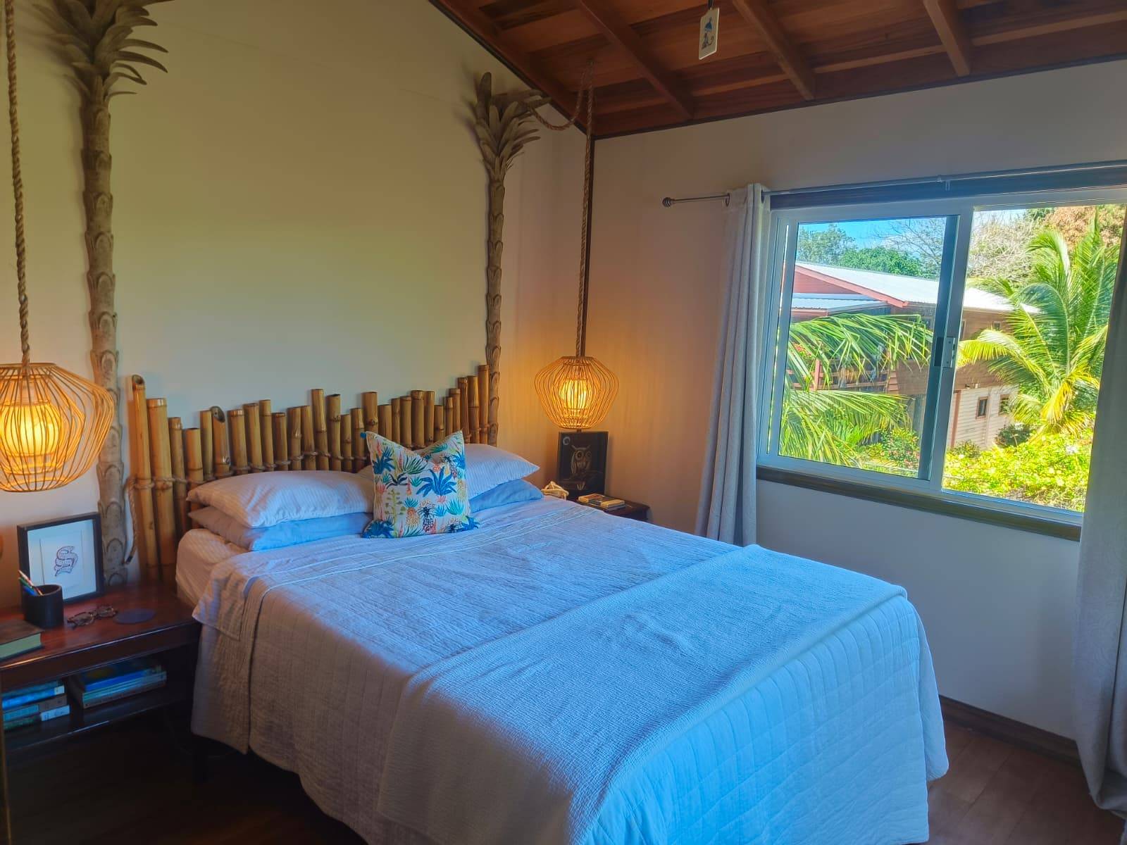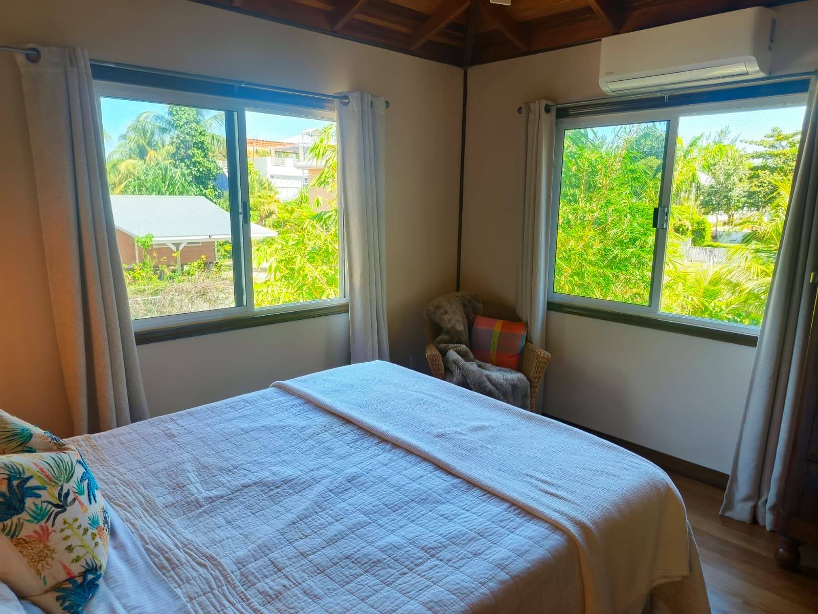 The bedroom is air‑conditioned and calm and large windows bring in natural light and lush green views. Air conditioning ensures year- round ease of living.