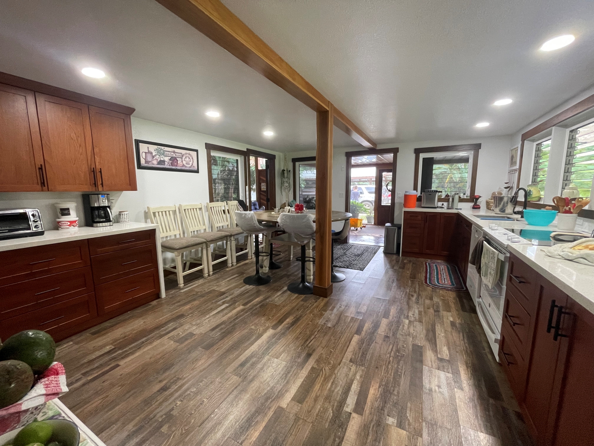 The estate’s infrastructure is exceptional. A 40×60 metal shop with 20-ft ceilings, a 30×40 plumbed barn, a 20×46 outdoor kitchen, a 24×26 carport, and two sea cans with roofs and shelving support farming, business, or expansion projects.